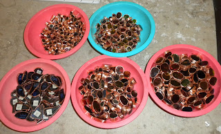 The flowers, are, for the most part made up of two to five pieces of glass (blossom, stem, leaves)--although the smallest ones are just one piece of glass (about an inch or so). Here they are tack soldered together.